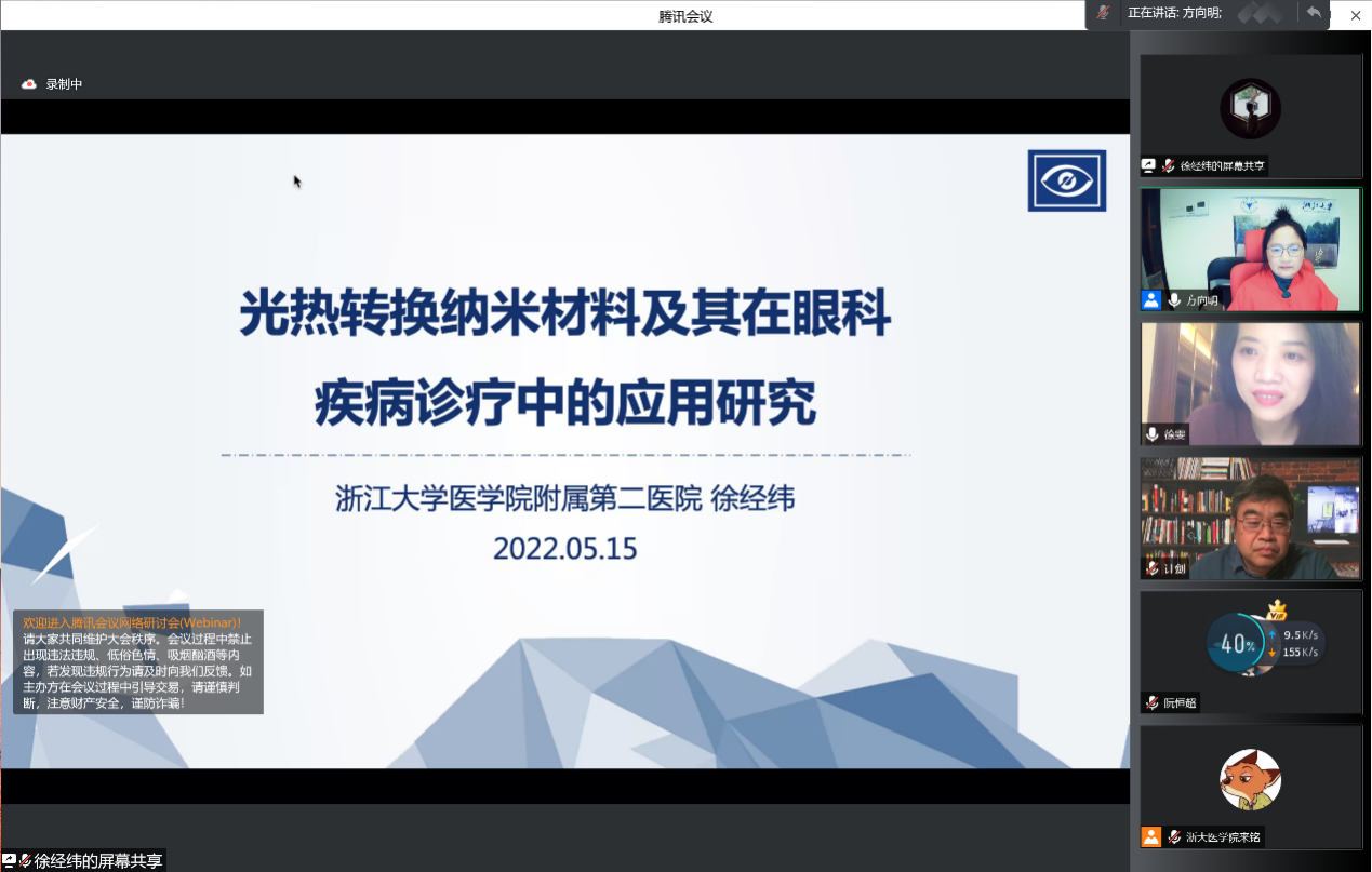 在报告中,徐经纬结合专业知识与个人学习经验,阐述了光热转换纳米材料的特性与分类,并介绍了附属第二医院眼科中心近年来通过与浙江大学转化医学研究院、浙江大学高分子材料与科学学系等院系的不同研究团队交叉合作获得的相关研究成果。这些研究从感染性角膜炎、感染性眼内炎、后发性白内障等眼科疾病的临床诊疗需求出发,制备了铜源复合纳米凝胶、贻贝仿生聚多巴胺纳米涂层等材料,证明了光热转换纳米材料在眼科生物医用材料研究领域的应用潜能。